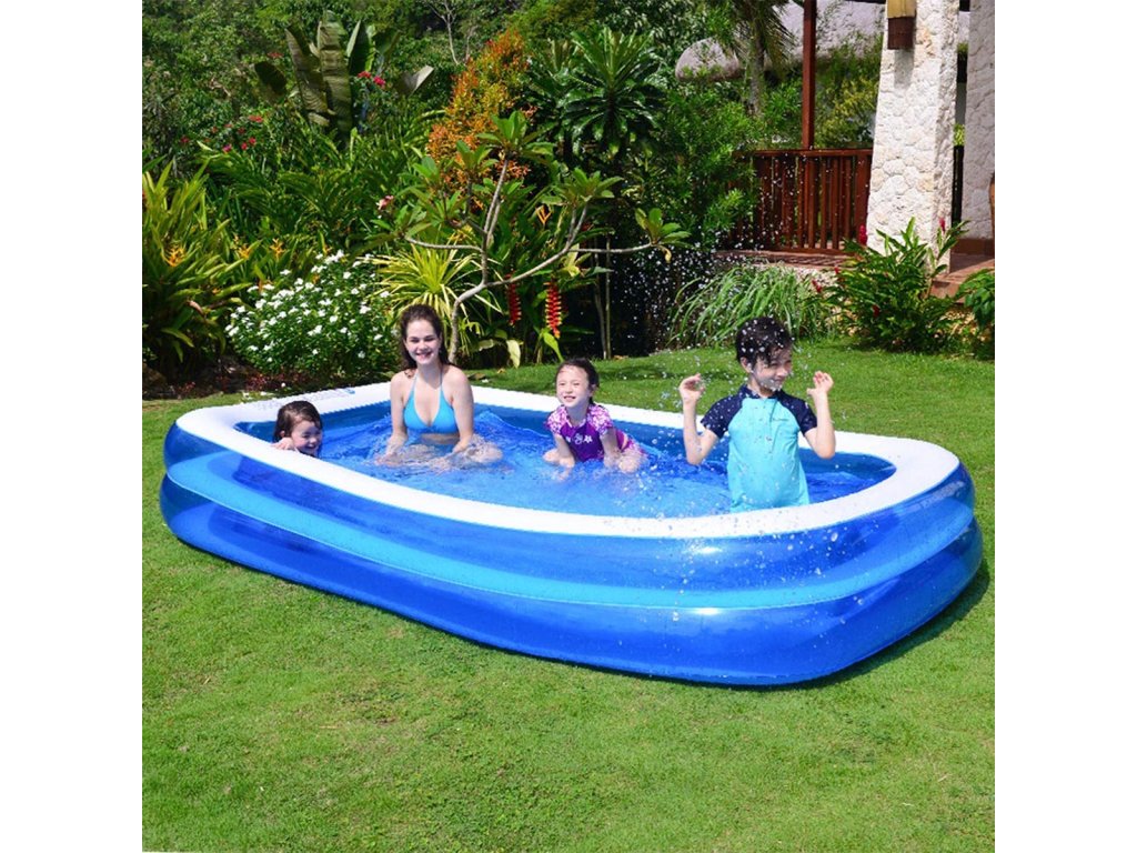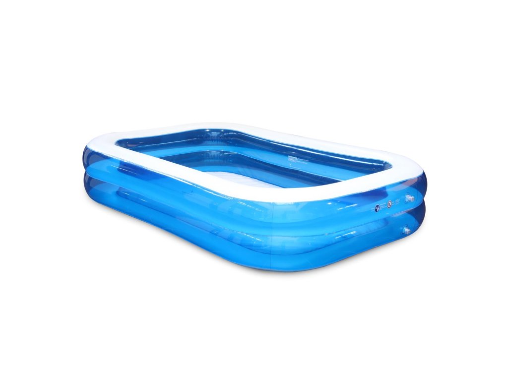 Obdélníkový dvoukomorový dětský nafukovací bazén najde své místo na každé zahradě. Pevné stěny jsou vyrobeny z průhledného a pevného vinylu. Dva trojfázové propojovací ventily. ventil pro snadné vypouštění vody.