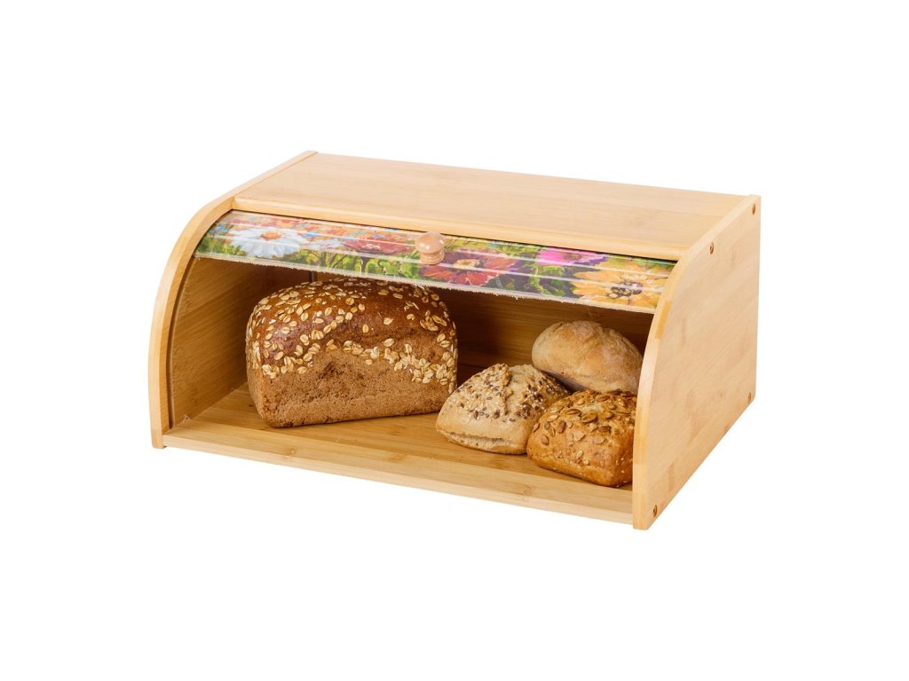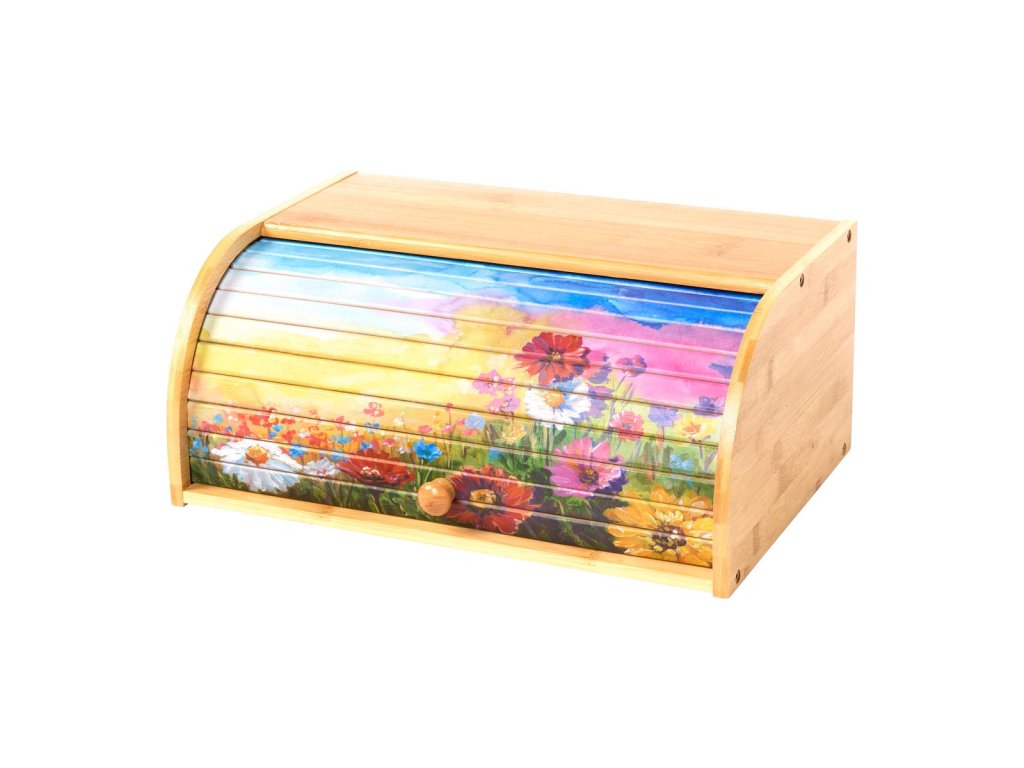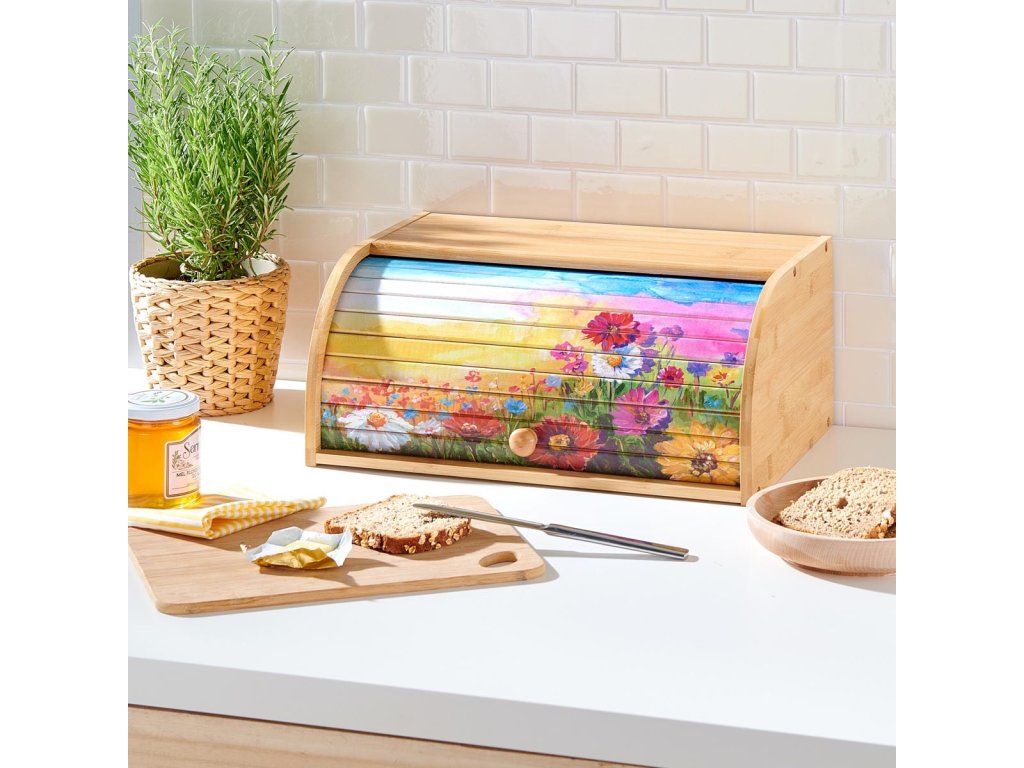 Rolovací víko s barevnou květinovou loukou vnese do vaší kuchyně čistě letní náladu! Pečivo všeho druhu je v tomto originálním bambusovém chlebníku dobře chráněno před vysycháním, tvorbou plísní a vydrží déle čerstvé.