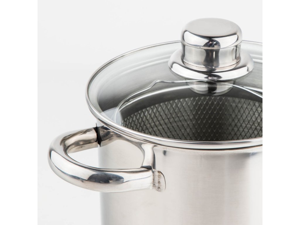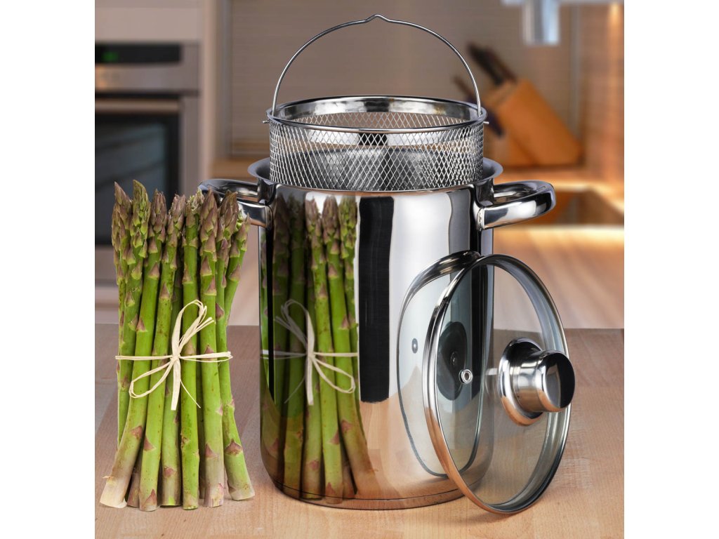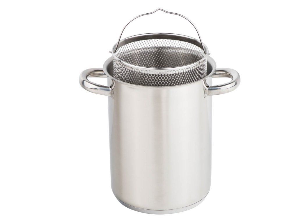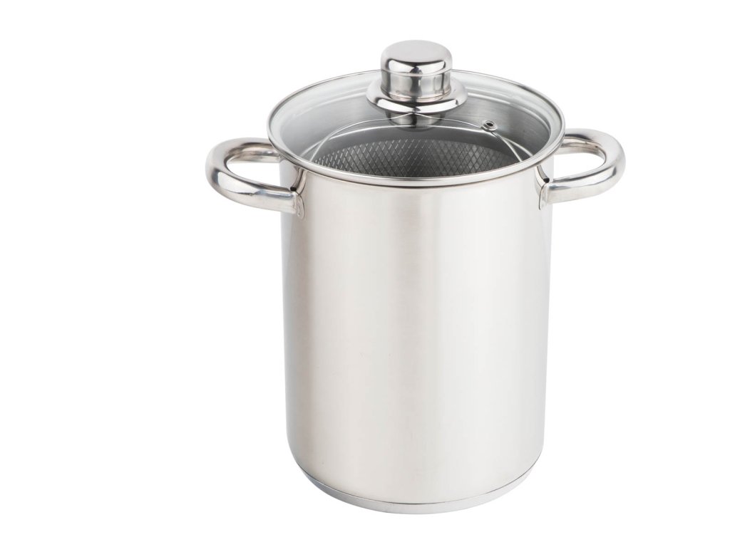 Úzký vysoký hrnec se skleněnou poklicí, nerezovými uchy a drátěnou vložkou je ideální na přípravu těstovin, především špaget. S vnitřním drátěným košem hotové těstoviny snadno a bezpečně vyndáte i bez cedníku.