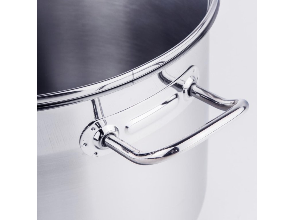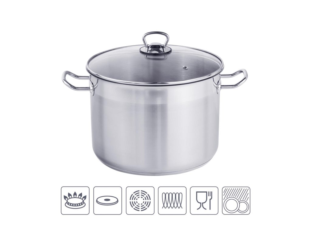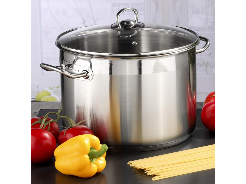 Velkokapacitní hrnec je vyrobený z kvalitní nerezové oceli, která je v horní části leštěná a ve spodní kartáčovaná matná. Jistě oceníte jeho 6mm zapouzdřené hliníkové dno pro rovnoměrné vaření se stabilní teplotou a skleněnou poklici s otvorem pro odvod páry.