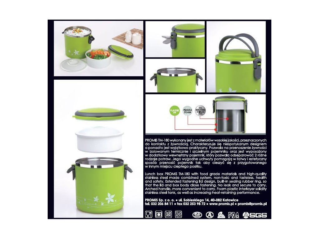 Jídlonosič s objemem 1,8 litrů, se sklopným držadlem pro přenášení, hermeticky uzavíratelný, uvnitř vložená nádoba se samostatným víčkem. Dvojitá stěna. Víčko s aretačním zámkem.Vhodný pro uskladnění do lednice.