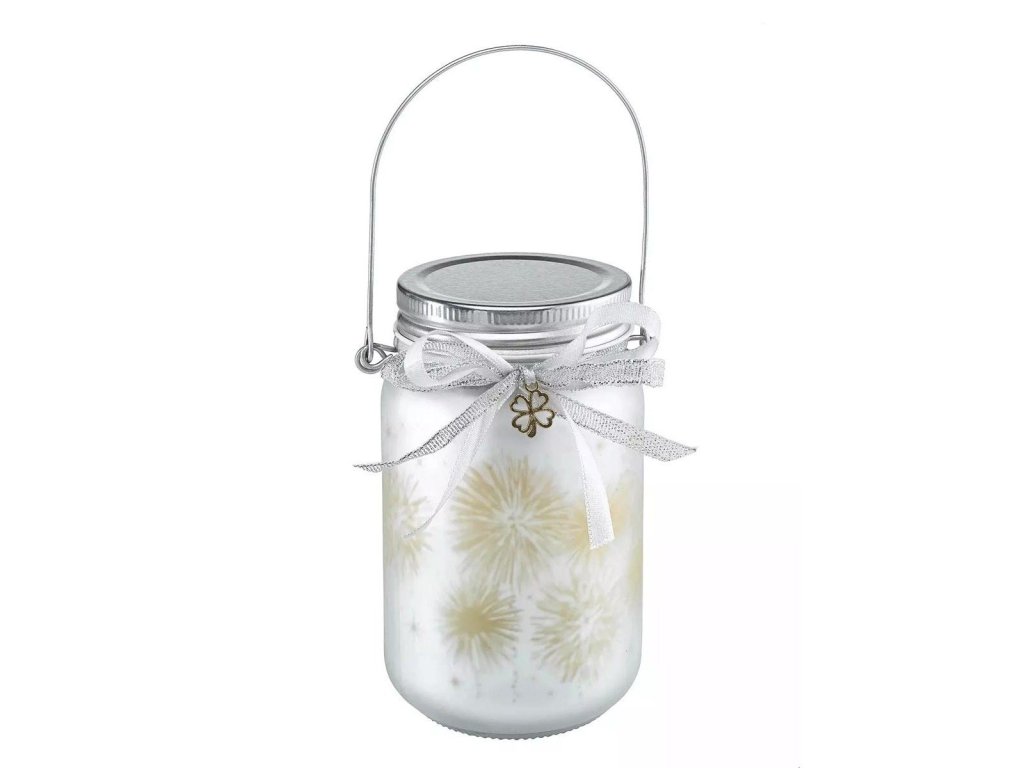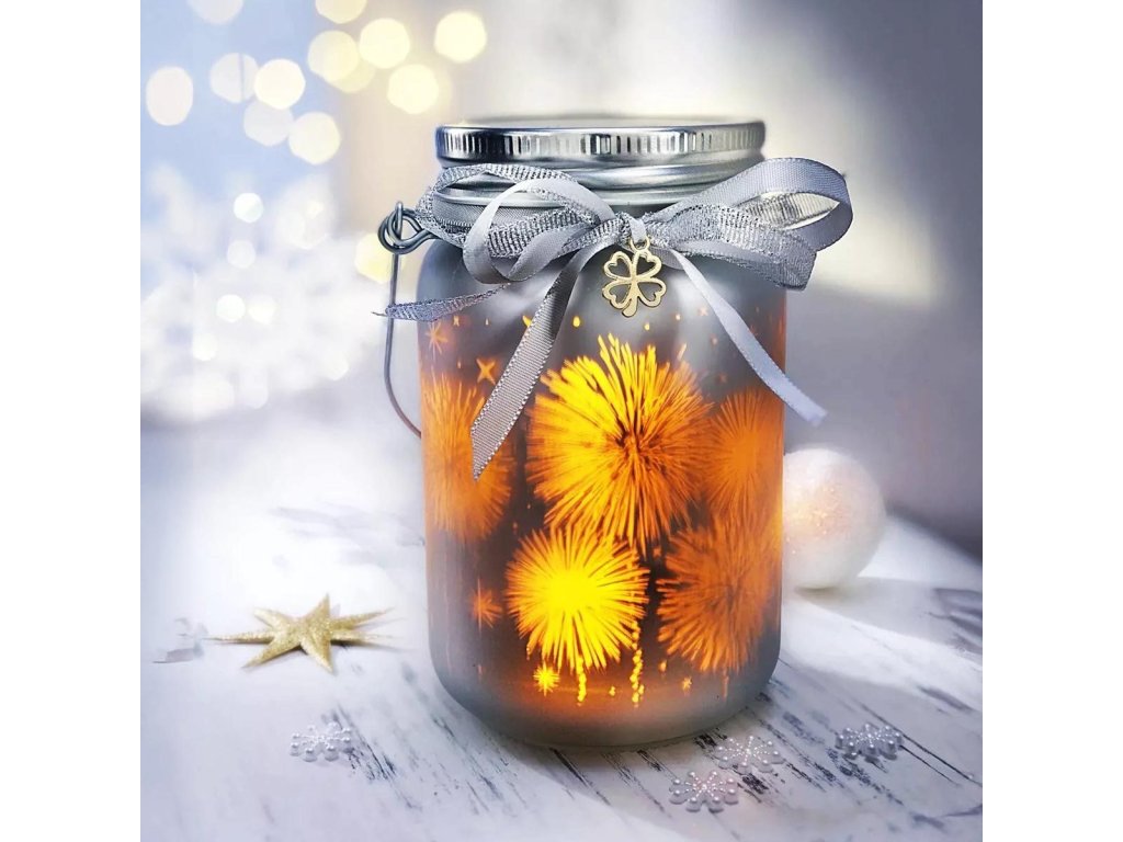 Půvabná skleněná lucerna s ohňostrojem vytváří kouzelnou atmosféru díky pohyblivé simulaci plamene s jantarovými LED diodami.Skleněná lucerna s kovovým víkem a zdobena mašlí se čtyřlístkem pro štěstí.