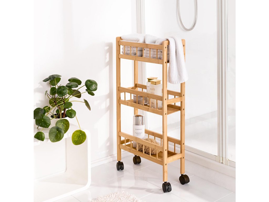 Úzký bambusový regál do koupelny či kuchyně je flexibilní díky 4 kolečkům s hladkým chodem.
