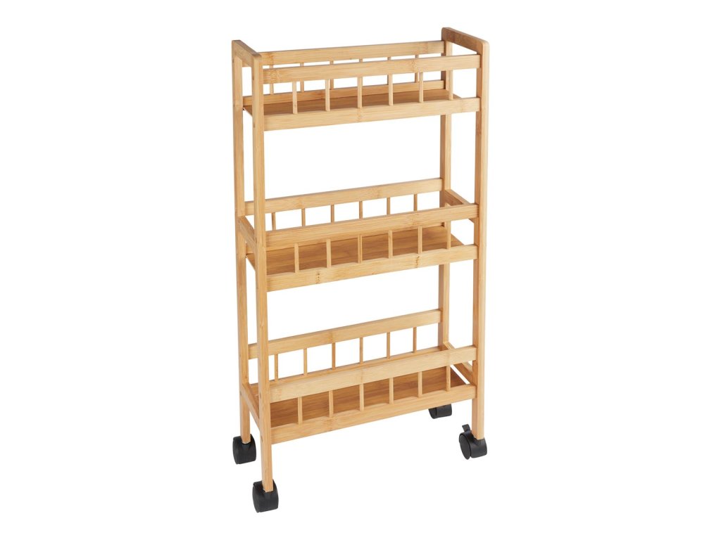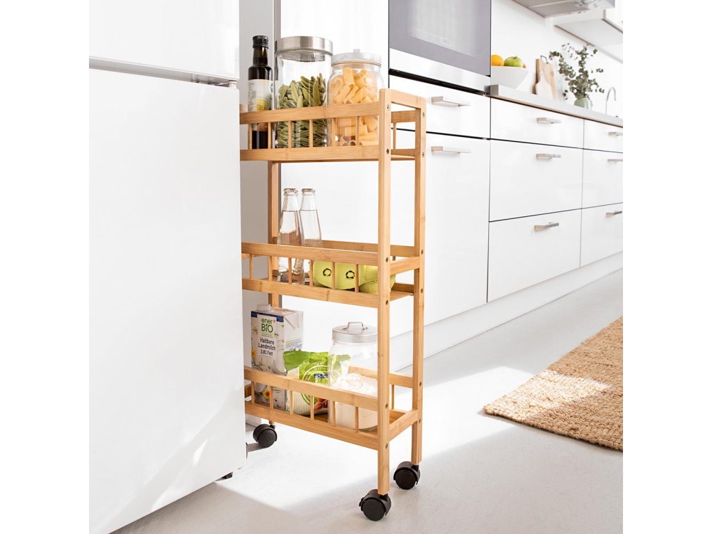 Zejména v malých místnostech má každý úložný prostor cenu zlata - tento pojízdný vozík pro domácnost z robustního bambusu je to pravé. Na třech úrovních nabízí spoustu místa pro vaše zásoby, kuchyňské nebo úklidové potřeby a mnoho dalšího! Je mimořádně úzký, takže se vejde do jinak nevyužitých výklenků.