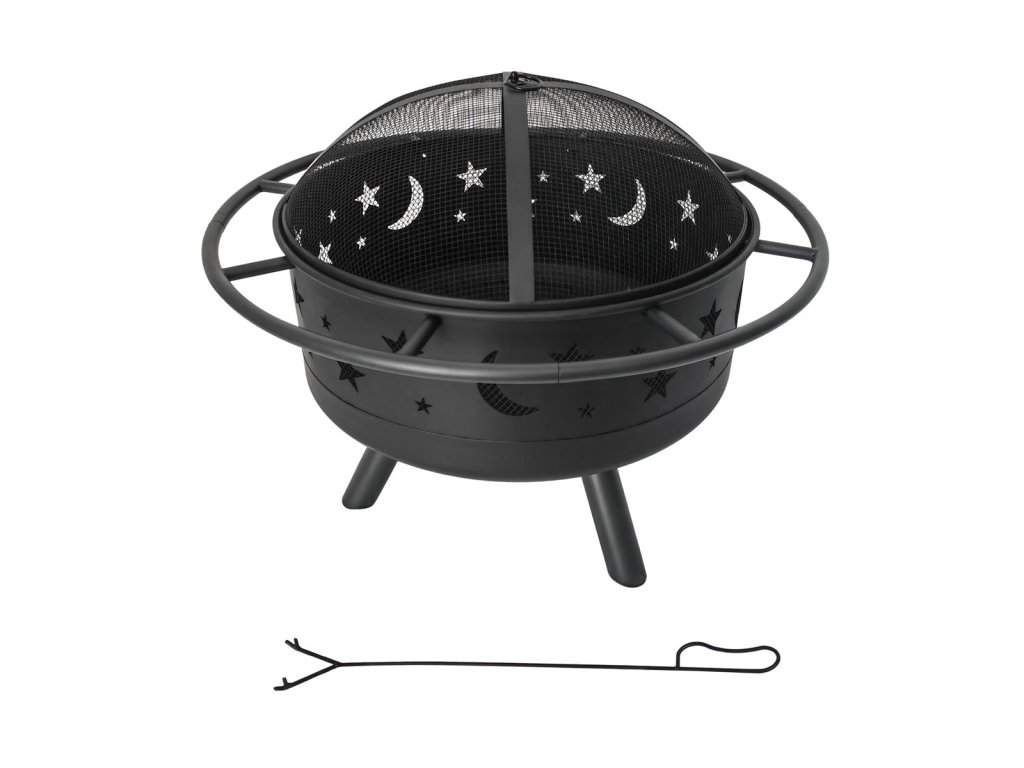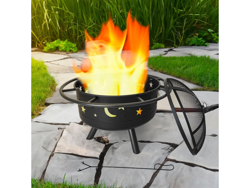 Vychutnejte si teplo otevřeného ohně s tímto stylovým a bezpečným zahradním ohništěm. Elegantní kulatý design s dekorativními výřezy hvězd a měsíce dodá vaší zahradě jedinečnou atmosféru, zatímco ochranná mřížka proti jiskrám zajistí bezpečné použití.