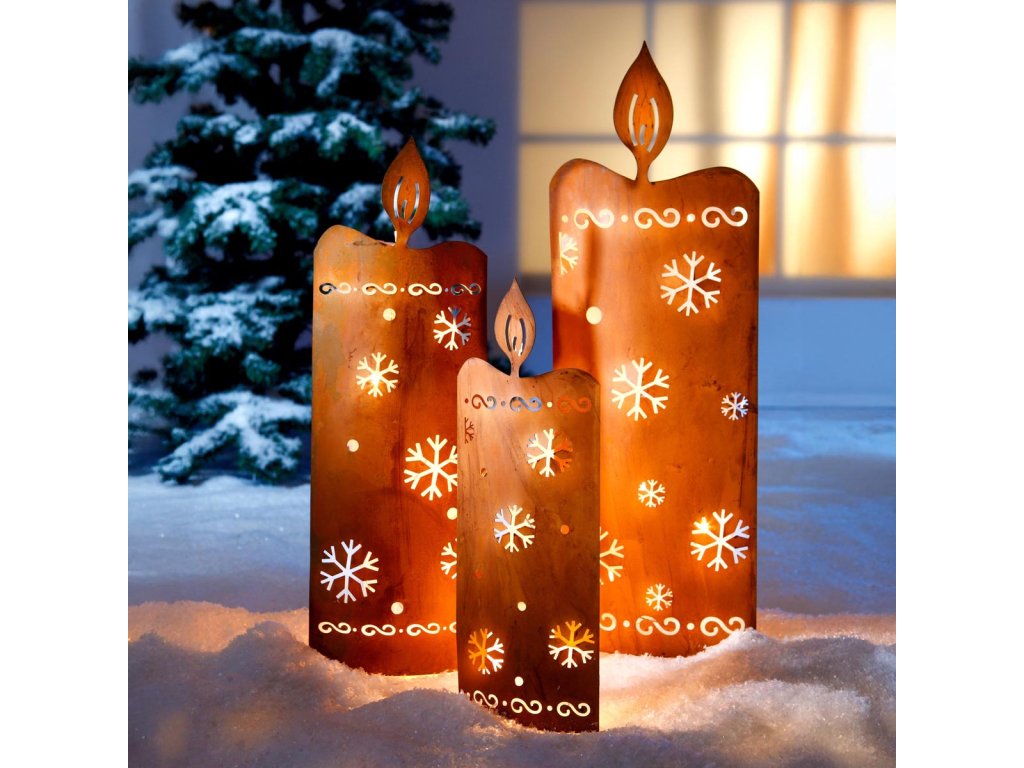 Tři kovové zápichy v podobě svíčky s výřezy ve tvaru sněhových vloček a řetěz se 17 LED diodami.