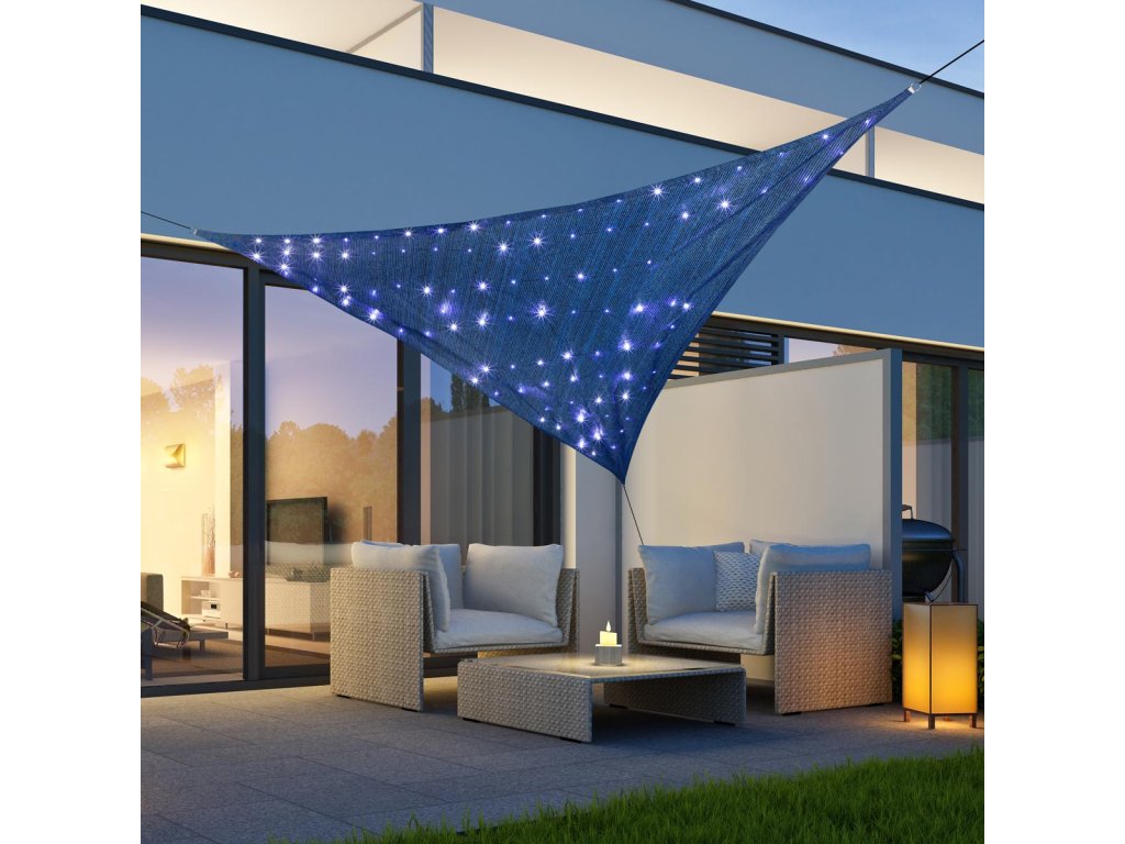 Tato stínicí plachta s LED diodami je dekorativním a praktickým doplňkem venkovního prostoru.