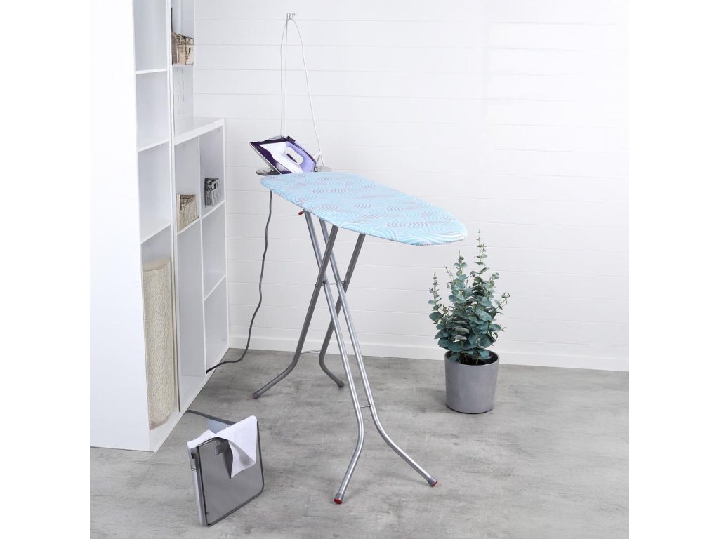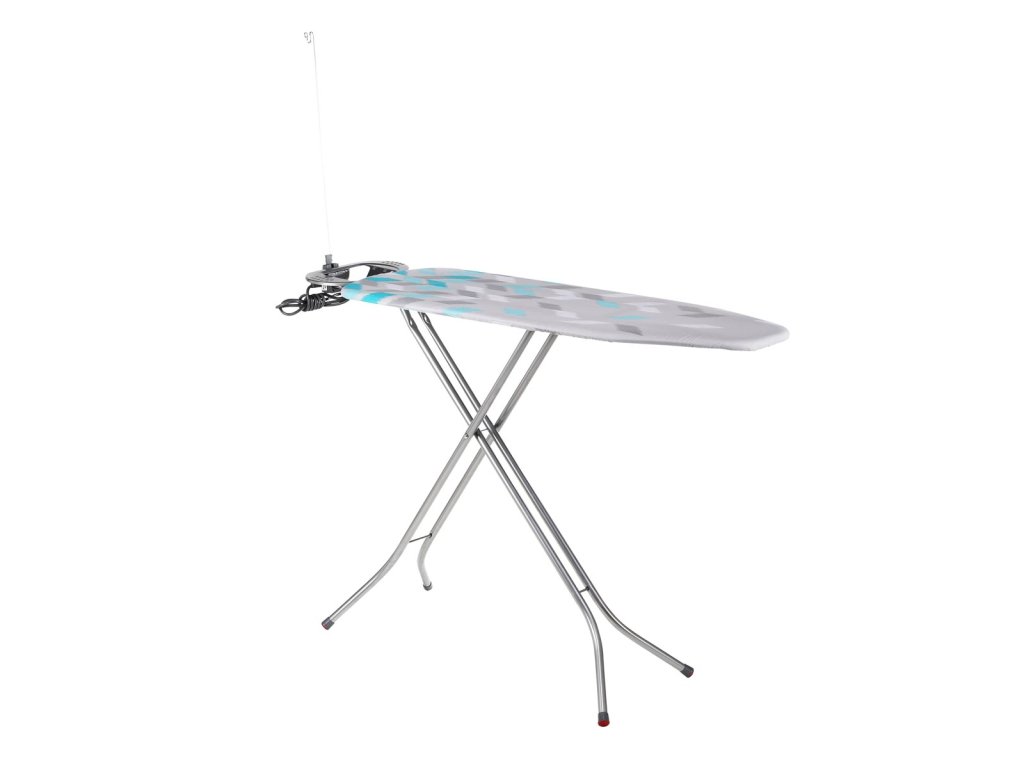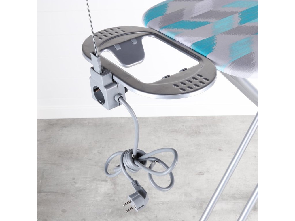 Robustní čtyřnohý základový rám (Ø 22 mm) zajišťuje bezpečné postavení při každém žehlení. Prkno je vybaveno zásuvkou a 2metrovým kabelem, takže máte vždy vše po ruce. Dodatečný komfort nabízí odkládací plocha na žehličku.