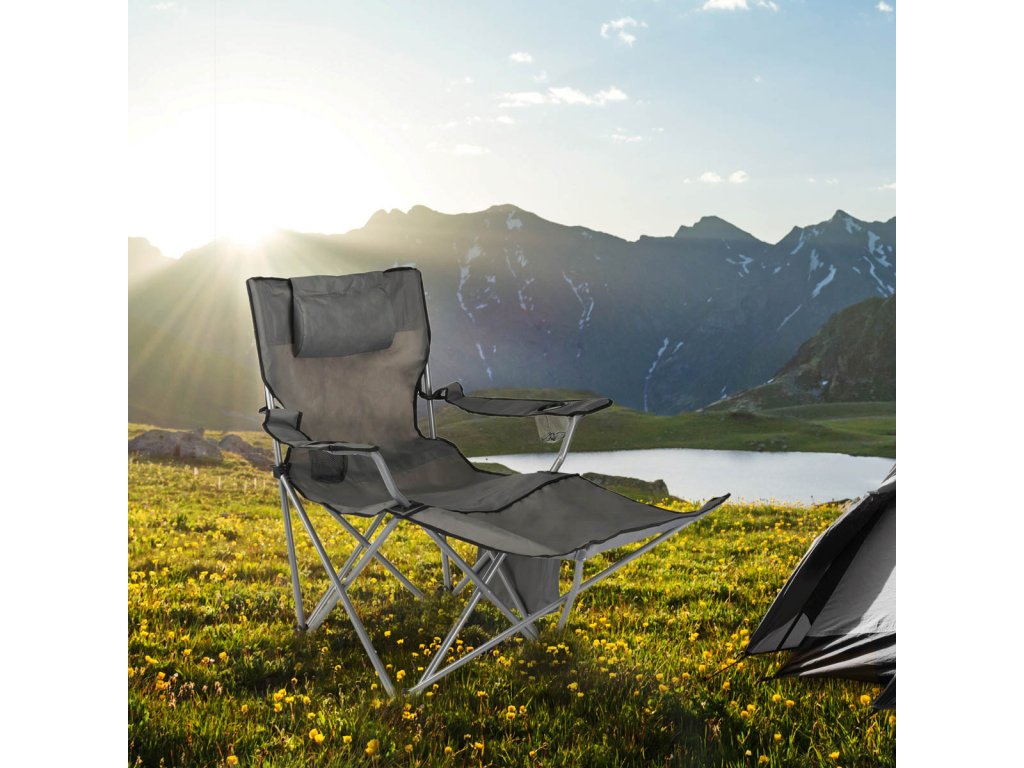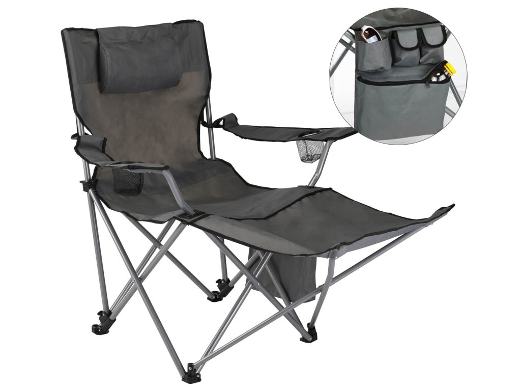Tato kempingová židle má robustní ocelový rám a materiál sedáku je vyroben z pevné tkaniny 600D oxford, která je známá svými vysoce odolnými a nepromokavými vlastnostmi. Dodávaná opěrka hlavy a opěrka nohou navíc poskytují dodatečné pohodlí. Kromě toho díky integrovanému držáku na nápoje, chladicímu vaku a úložným taškám můžete mít vše potřebné na dosah ruky.